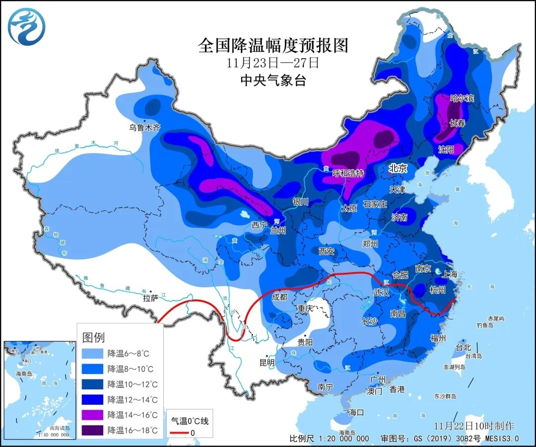 23-27日,我国大部地区自西向东、自北向南降温6~10℃,西北地区中东部、华北北部、内蒙古及东北等地降温12~14℃,局地16℃以上;上述地区并伴有5~6级风,阵风7~9级。