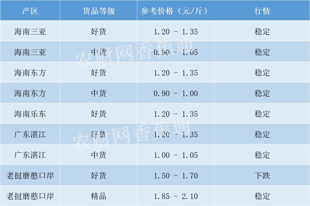海南三亚商场主流妙品参考价钱为1.20-1.35元/斤,中货价钱为0.9-1.05元/斤,较上一日价钱踏实。蕉农随行要价,下流拿货严慎,商场成交情况邃密,成交以质讲价。