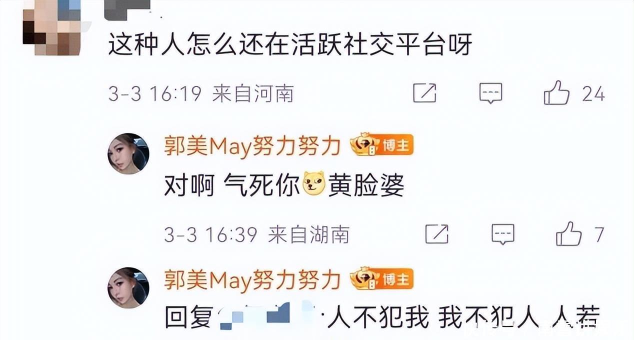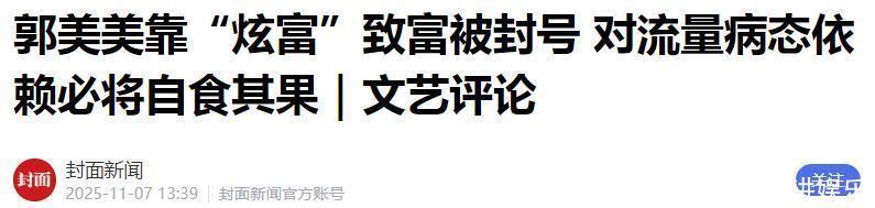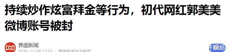 2025年11月6日,微博平台发布公告,对郭好意思好意思的账号作出永恒封禁责罚。原因是她耐久发布炫富、拜金推行,宣传不良价值不雅,并通过这些推行进行买卖变现。无数网友围不雅点赞,评述区一派叫好,有东谈主说“终于比及这一天”,也有东谈主示意“早该如斯”。