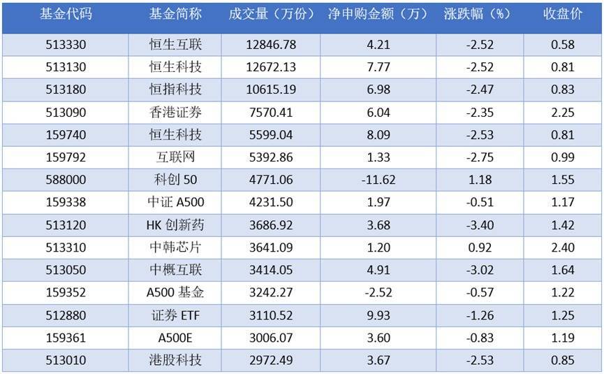 从成交量上来看,2025年10月13日成交量最大的是恒生互联(513330),成交量为12846.78万份。排行靠前的恒生科技(513130)、恒指科技(513180)、香港证券(513090),成交量别离为12672.13万份、10615.19万份、7570.41万份。