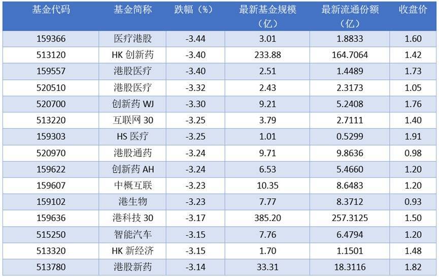 下落方面,2025年10月13日跌幅最大的是医疗港股(159366),跌幅达到3.44%。排行靠前的HK立异药(513120)、港股医疗(159557)、港股医疗(520510),跌幅别离为3.40%、3.40%、3.32%。