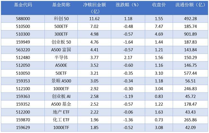 资金流出方面,2025年10月13日净赎回金额最多的是科创50(588000),赎回金额11.62亿元。排行靠前的500ETF (510500)、300ETF(510300)、创业板50(159949),赎回金额别离为7.02亿元、4.98亿元、4.76亿元。