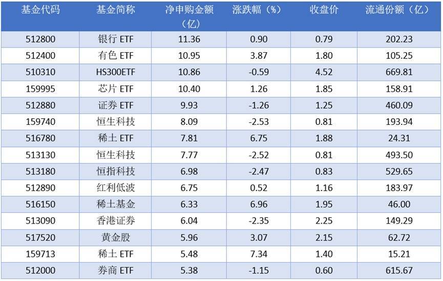 细分到资金流动情况上来看,2025年10月13日净申购金额最大的为银行ETF (512800),当日净申购金额为11.36亿元。排行靠前的有色ETF (512400)、HS300ETF(510310)、芯片ETF(159995),申购金额为10.95亿元、10.86亿元、10.40亿元。