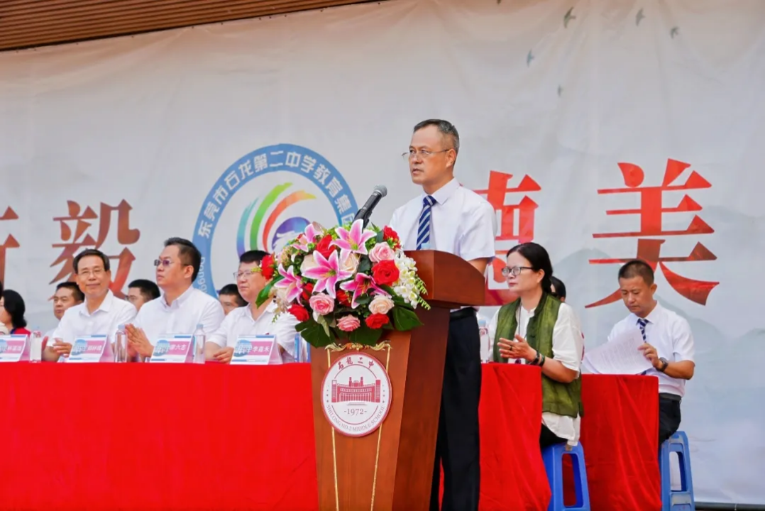 在尊严的奏唱国歌庆典后,学校党总支文告林宗庆深情回归了学校53载高亢征途。从1972年创办之初的毛糙平房、土壤操场,到如今获评东莞市品牌学校、东莞市石龙第二中学造就集团龙头学校的当代化校园,他以“师生共同运红土建操场”的创业故事,纯真阐明注解了“繁难高亢、受罪耐劳、低调求实、心聚一处”的二中精神。
